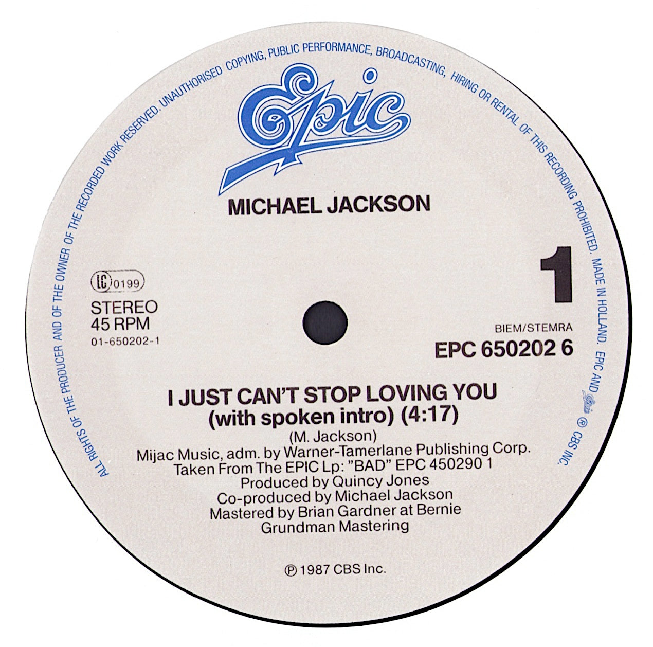 Michael Jackson ‎- I Just Can't Stop Loving You